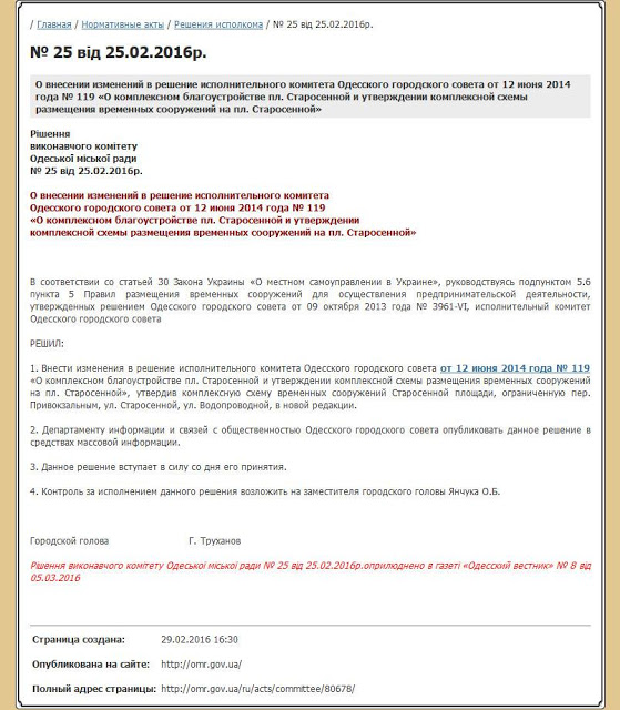 Так, оприлюднений на офіційному сайті проект комплексного благоустрою, нібито затверджений рішенням виконавчого комітету Одеської міської ради від 25.02.2016 № 25, містить 2 різних варіанти схеми розміщення тимчасових споруд, які повинні були встановлюватись на Старосінній площі.