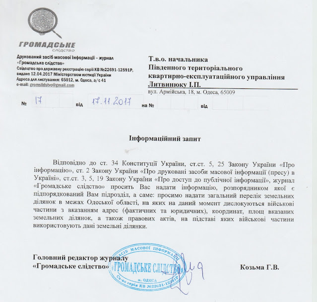 Для обгрунтування своєї позиції, від імені редакції журналу я запитав в Південному територіальному КЕУ Міноборони ті ж відомості, які вимагались від військових на нараді.